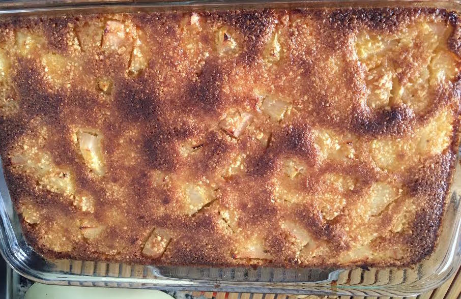 Colocar as pêras num tabuleiro de ir ao forno e verter a massa por cima, não necessita de untar o tabuleiro.
