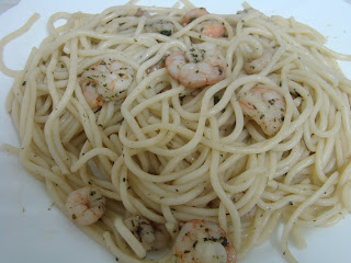 Escorrer a água do esparguete e juntar ao preparado dos camarões, envolvendo bem, em lume brando.